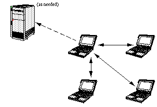 FIGURE 2. Example of a peers communication model. A machine can talk directly to other machines on the network, without having to go through a centralized server. However, it can still communicate with the server as needed. The peers model, easily enabled by the EC architecture, is much less constrained than client/server. In a peers model, machines on the network communicate directly with each other through a shared context. This is facilitated with current multiplex networks, particularly the Internet. Unlike client/server, there is no additional architectural requirement for a centralized server to process messages.